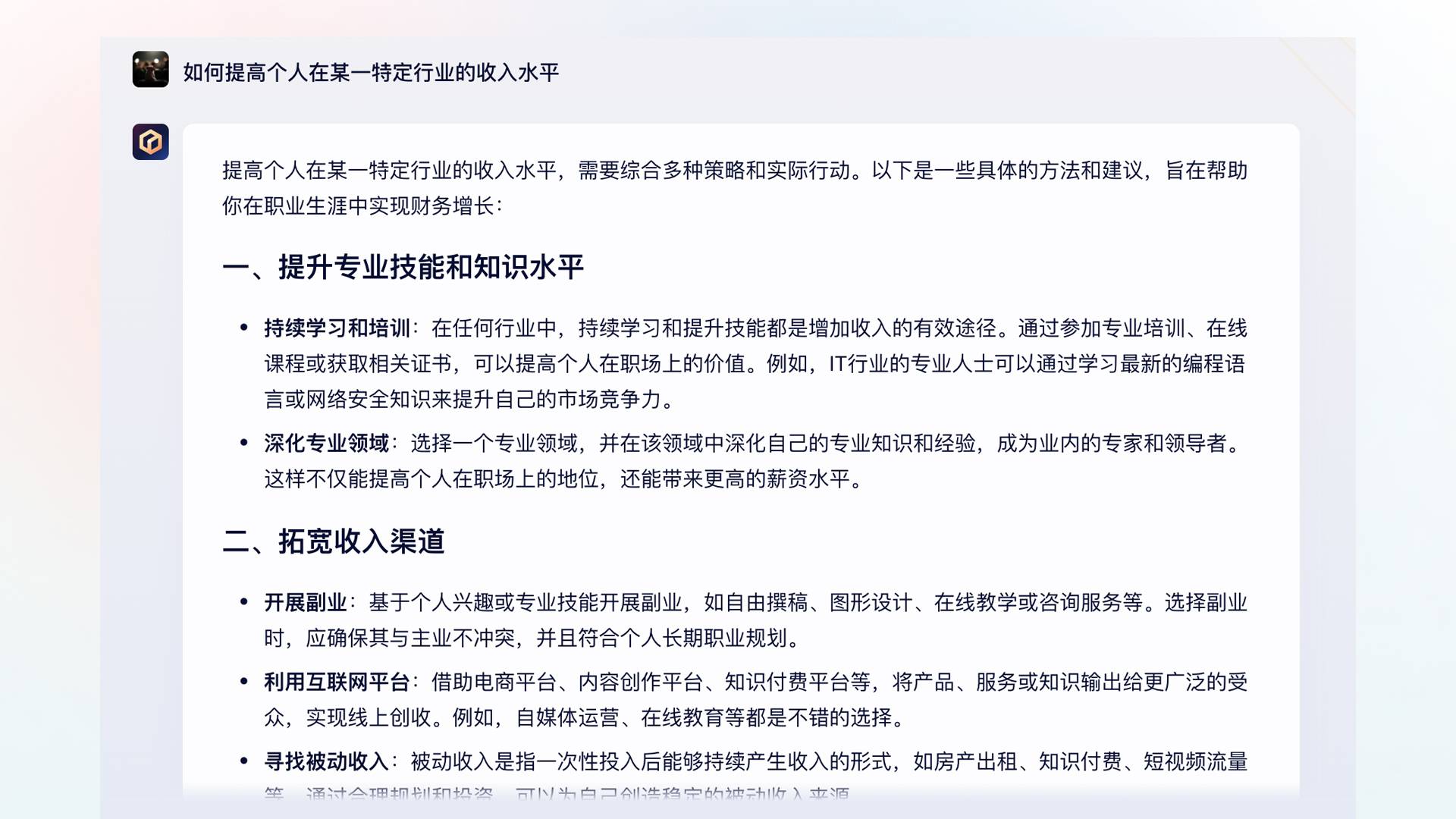 避免开放式和过于宽泛的问题:尽管我们有时喜欢和 AI 闲聊,但如果我们希望它解决具体专业问题或提供有效信息,就应避免提出过于宽泛的问题。例如,“如何成为世界首富” 这样的问题过于宽泛且不具有实际解决问题的导向性。我们应更倾向于提出像 “如何提高个人在某一特定行业的收入水平” 这样相对具体的问题。