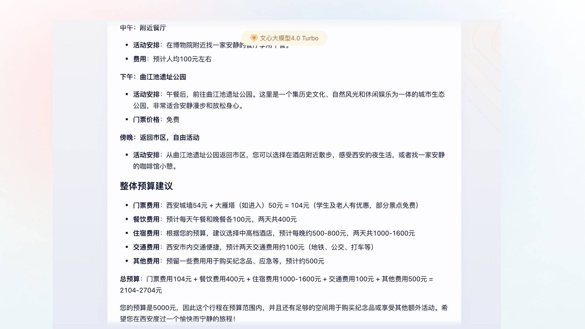 为了获得更高质量的回答,我们需要向AI提供更多具体的信息和要求。比如,我们可以告诉它:“我想去陕西西安玩两天,请你以导游的身份为我制定一个行程。我喜欢安静的地方,不喜欢行程太紧凑。另外,请附上每个景点的门票价格和整体预算建议,我的预算大约是5000元。”通过这样的详细要求,Ai就能更加准确地理解我们的需求,并给出更加符合期望的旅游攻略。