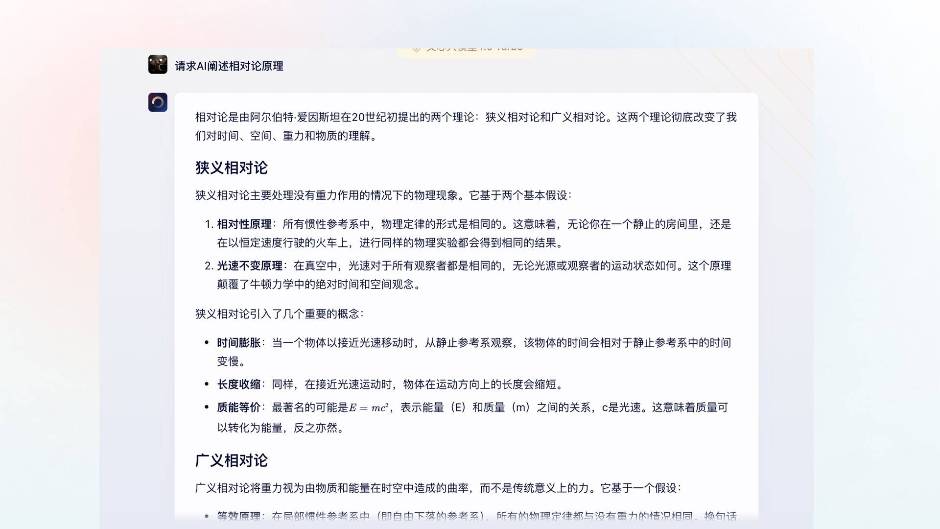 现在我们继续分享通过自我身份设定,引导AI输出更加贴合我们需求的、恰如其分的解答。接下来,让我们步入实操环节,以一个基础问题为例——请求AI阐述相对论原理。AI的初步回应倾向于学术化表述,这固然准确,但未必适用于所有听众。
