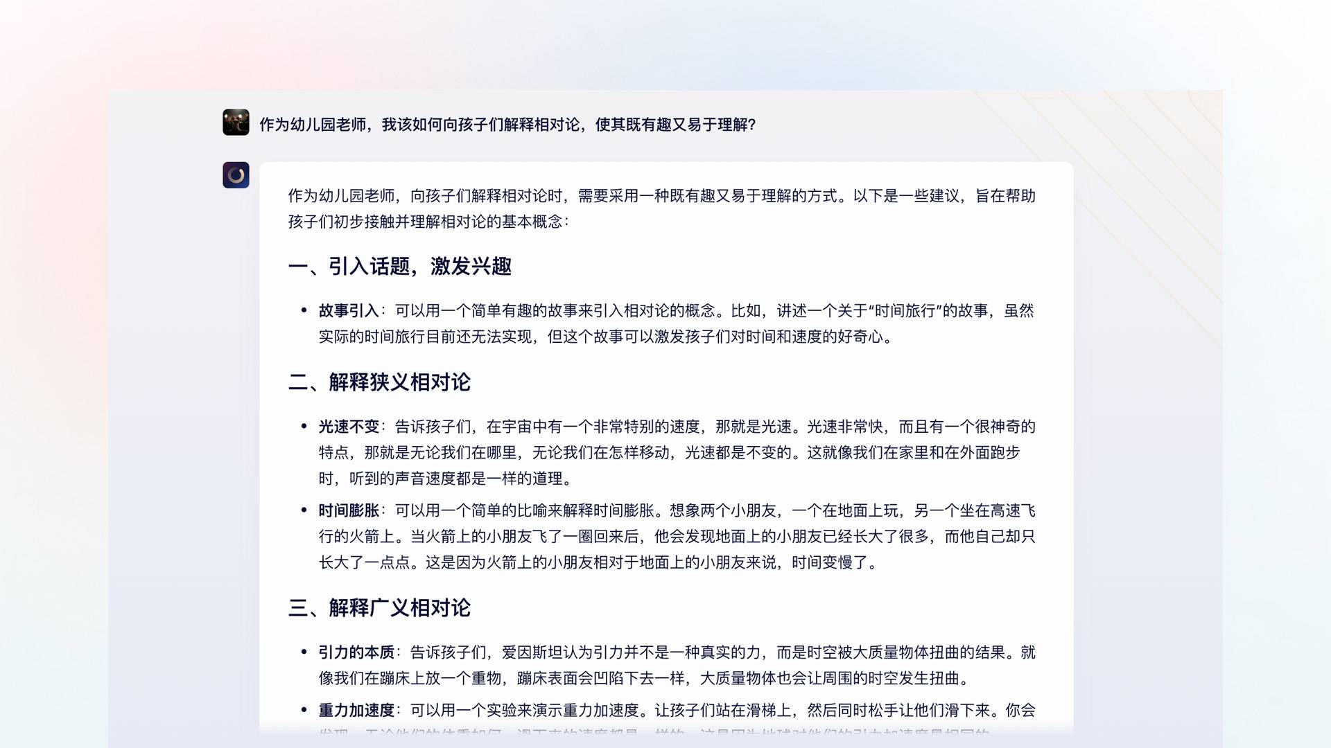 进一步地,让我们设定一个更为挑战性的场景:假设我们的身份是幼儿园教师,需要向小朋友们介绍相对论的概念。这时,我们向AI提出请求:“作为幼儿园老师,我该如何向孩子们解释相对论,使其既有趣又易于理解?”
