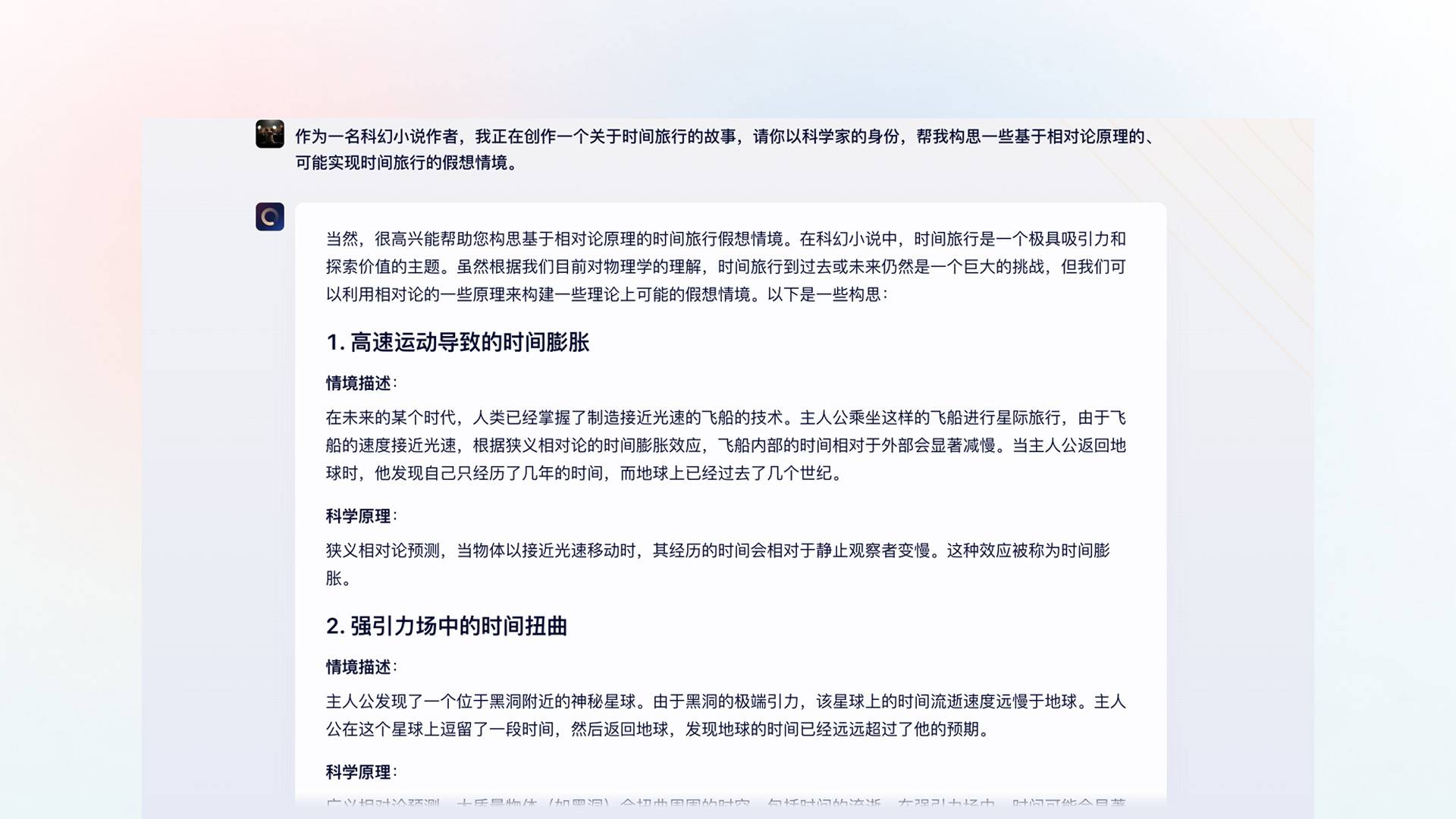 在这种设定下,AI不仅会结合相对论的核心概念,如时间的相对性、光速不变原理等,还可能创造性地提出利用黑洞、虫洞或高速运动的宇宙飞船等科幻元素作为时间旅行的媒介,为你的创作提供既富有想象力又具有一定科学依据的灵感。