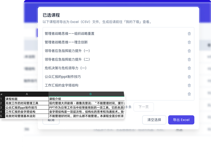 在课程列表中,可一次性勾选最多50门线上课程,点击导出即可生成Excel格式的课程清单。导出的表格包含课程名称、讲师、时长、核心内容等关键信息,拿来就能用,汇报、存档都方便。
